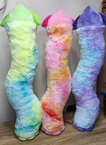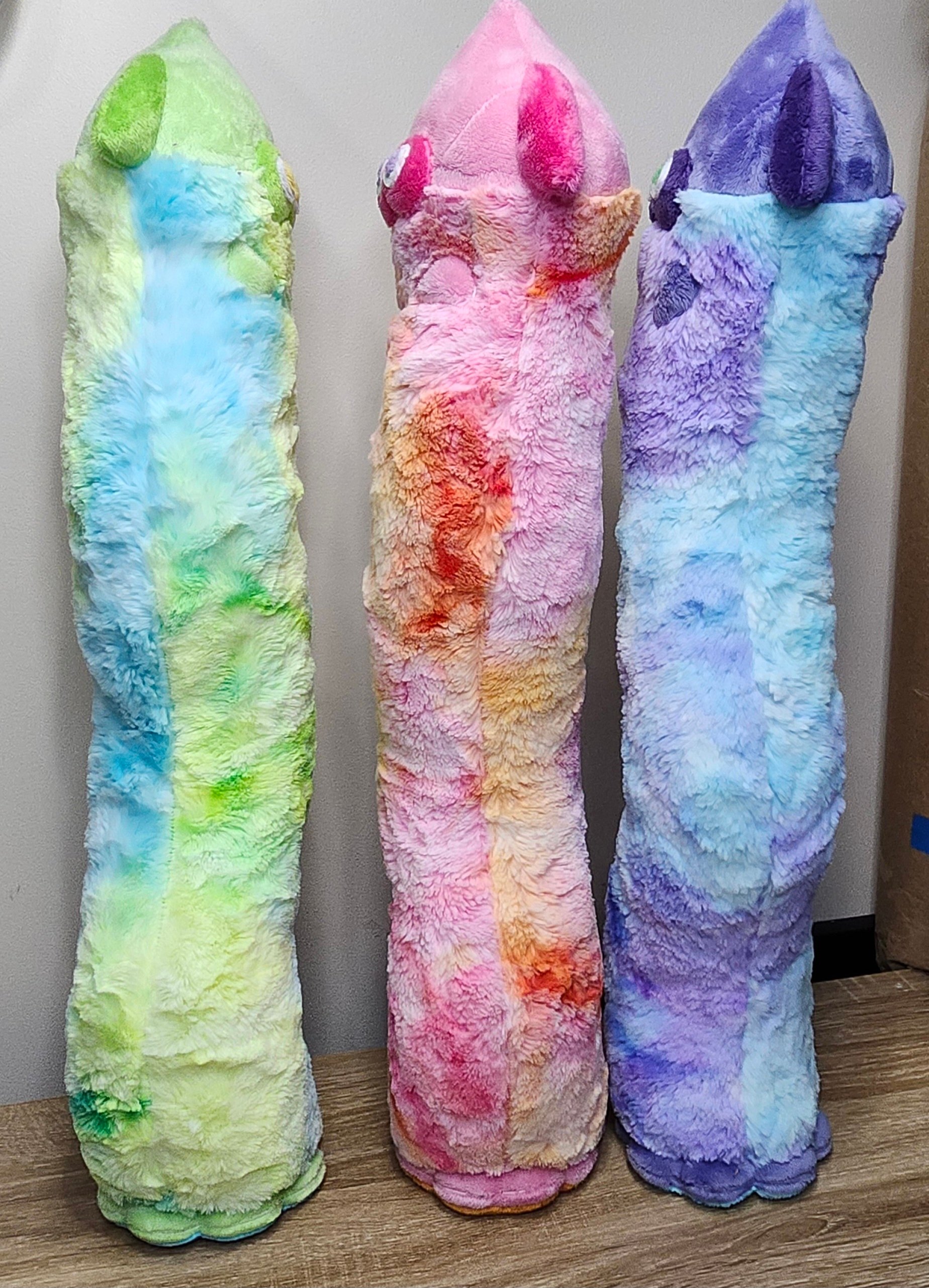 Each plush is about 24" tall. There is about 4" worth of poly pellets in the bottom to give it a bit of weight. They can stand on their own cause of this with a bit of balancing. The tie dye fabric is a luxe minky and is slightly longer and softer then the normal minky is!